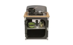 Die Tischplatte, die Ablage und das Gewebe dieses Küchentisches sind mit dem schicken Logo-Muster verziert. Dieser Küchentisch leistet nicht nur als stabile Arbeitsfläche beim Kochen wertvolle Dienste, sondern begeistert auch mit seinem geschlossenen Stauraum zur Unterbringung von Töpfen, Lebensmitteln und Gasflaschen. Mit seiner leichten Handhabung und seinem geringen Packmaß trägt er entscheidend zu einem fantastischen Kocherlebnis bei.